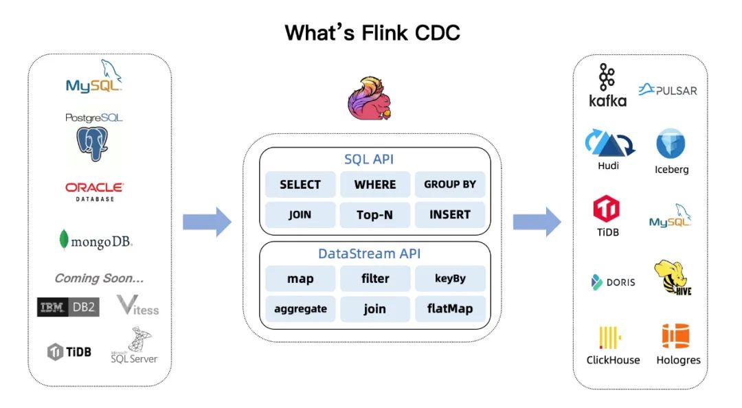因此,不论从性能还是适用范围上,Flink CDC 都可以作为最佳选择。Flink CDC Connectors是Apache Flink的一组source连接器,使用变更数据捕获 (CDC) 从不同的数据库中获取变更,Flink CDC连接器集成了Debezium作为引擎来捕获数据变化,所以它可以充分发挥Debezium的能力。目前连接器支持的数据库有:MySQL(5.6+)、PostgreSQL(9.6+)、MongoDB(3.6+)、Oracle(11+)、TiDB(5.1.x+)、SQL Server(2012+)和Oceanbase(3.1.x+)。