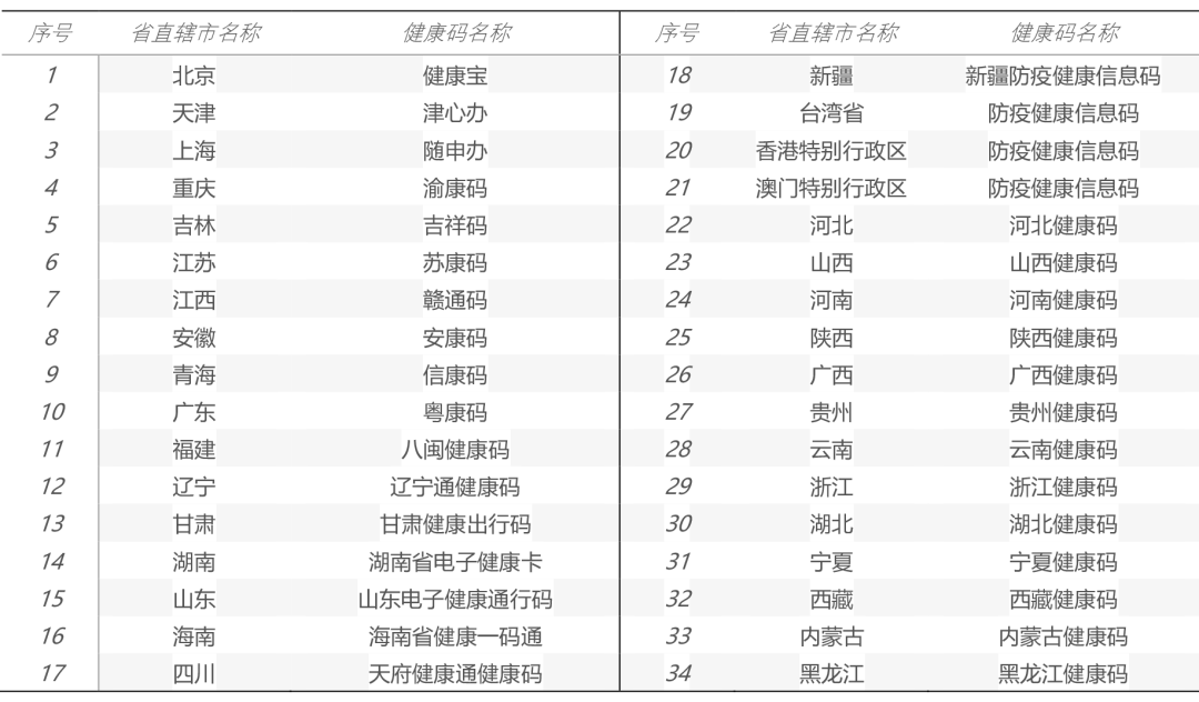 由于疫情防控是属地管辖,权责对应,每个地方都有各自的健康码,而且每个地方健康码的名称都不相同,比如上海的健康码叫“随申码”,吉林的健康码叫“吉祥码”,安徽的健康码叫“安康码”,武汉和浙江等多地的健康码以“省名称+健康码”命名,下表是我国34省直辖市健康码名称 。
