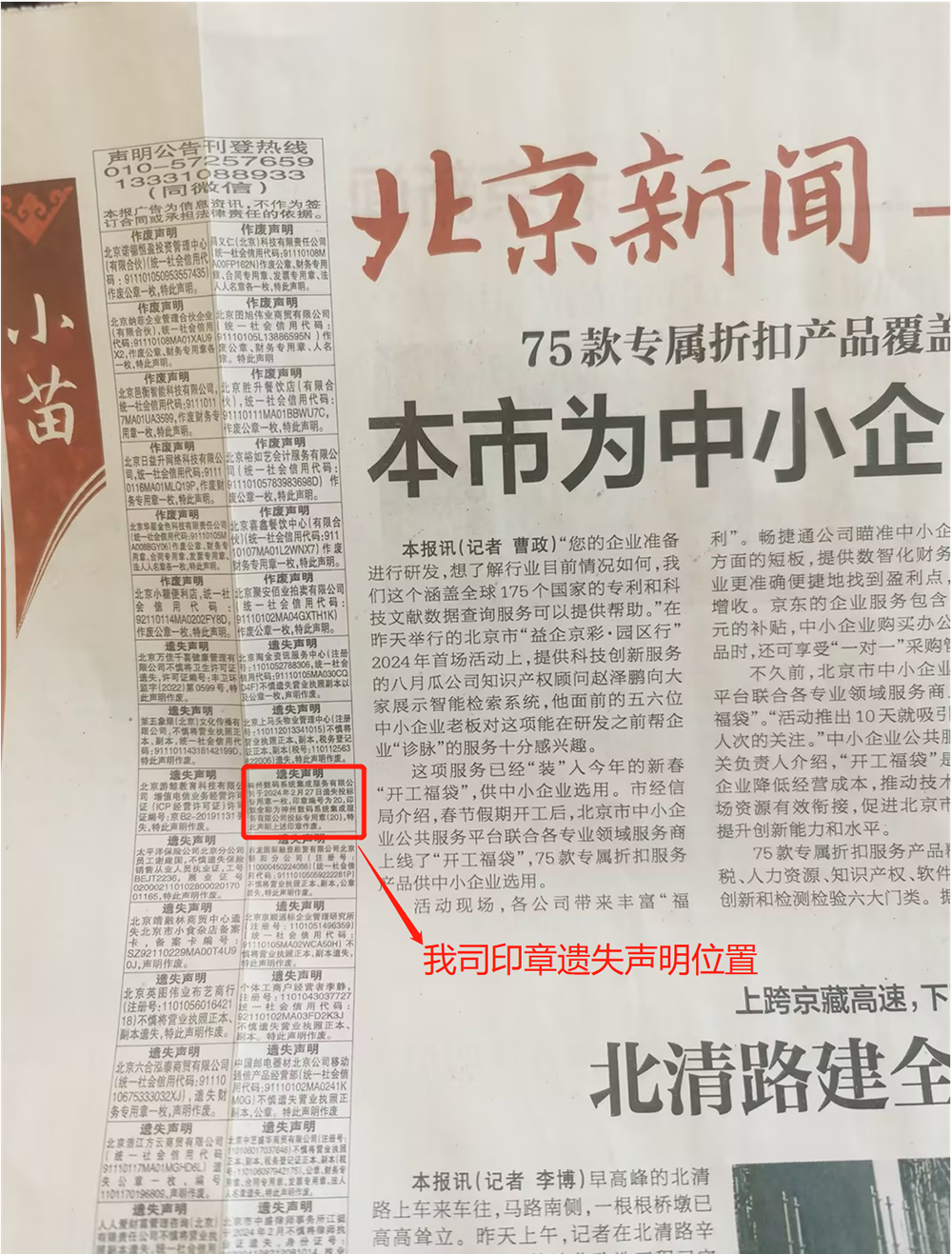 以上声明内容已在2024年3月2日期的北京日报上同步刊登(下已附图),如有捡拾到上述印章的,可联系我司接口人张梦(15590855018)予以归还!望周知!